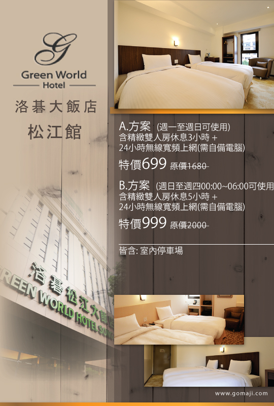 只要699元起,即可享有【台北-洛碁大飯店(松江館)】不分平假日~戀人專屬休息〈含A.精緻雙人房休息3小時(週一至週日可使用)/B.精緻雙人房休息5小時(週日至週四00:00~06:00可使用) + 24小時無線寬頻上網(需自備電腦) + 室內停車場〉